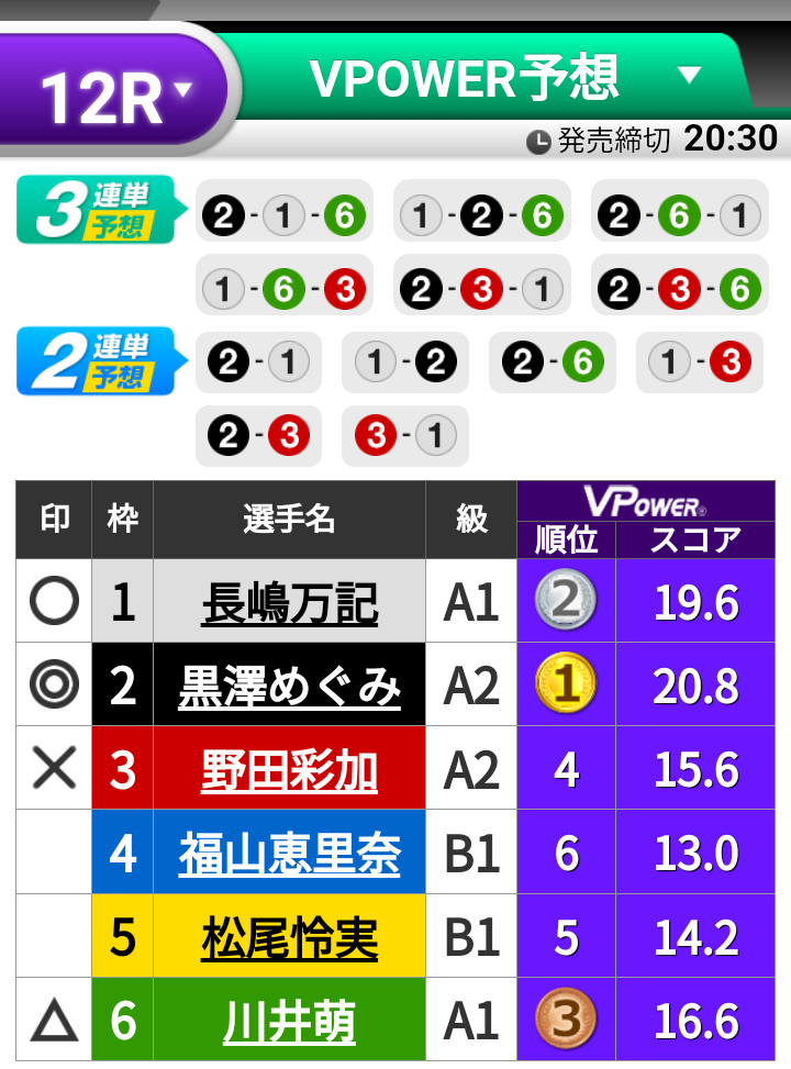 ⑫136⇒3連単 164 3,700円 13/野田:5S